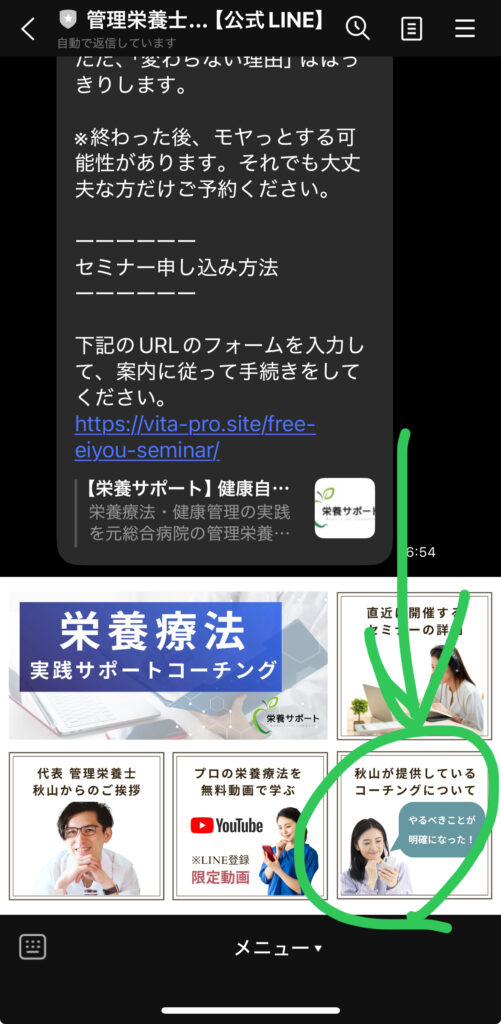 ↓公式LINE上で、写真の緑線で囲まれたボタンを押すと申し込み方法が確認できます。